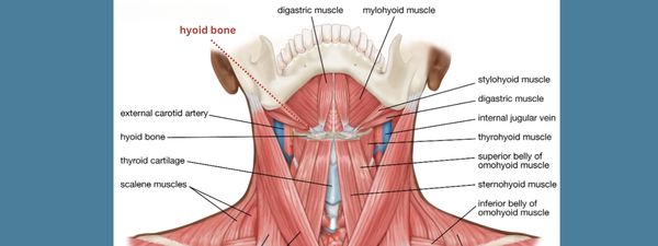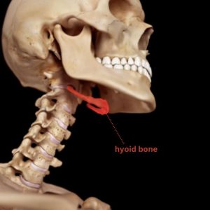 The hyoid bone is a horseshoe shaped bone that sits at the front of the neck (above the thyroid cartilage). It is an anchor point for many of the muscles of the tongue and throat. Although it doesn’t get much attention, it is an important structure for swallowing, speech, chewing and breathing.